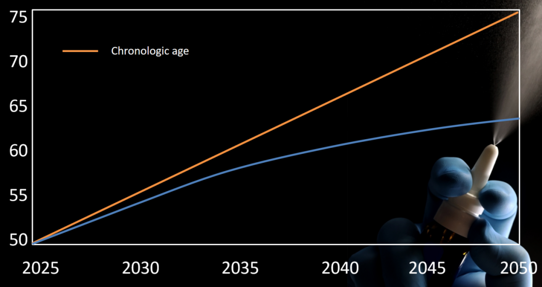 做一个对比的话,从2025年开始,橙色的线表示我们正常变老的速度,如果我们使用了一些跟AI相关的技术的话,衰老曲线会慢慢往下降为蓝色的线,这就是一种寿命逃逸速度,未来科技可以帮我们更健康更缓慢地变老。