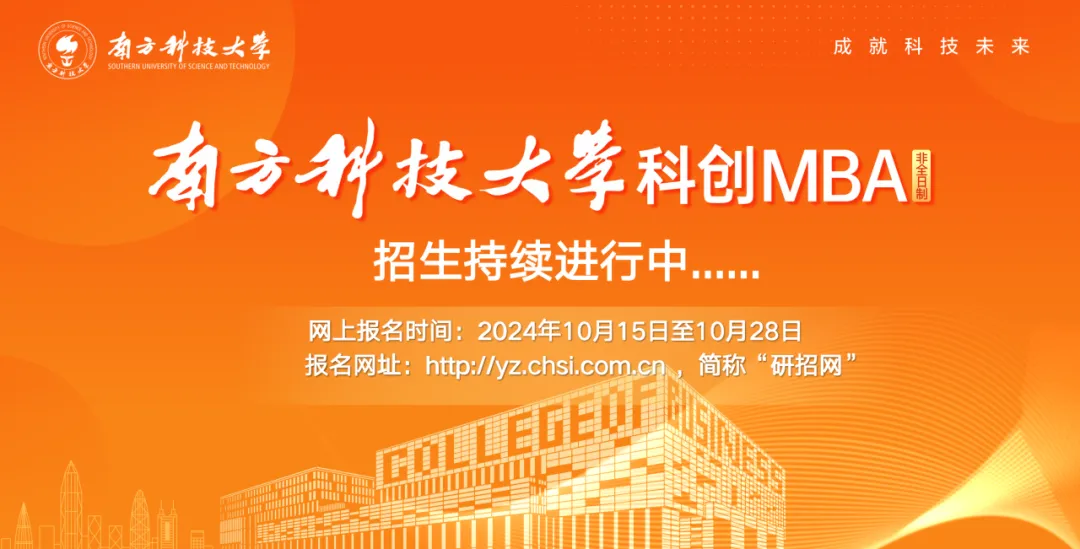 南科大商学院科创MBA项目,致力于充分结合学校在理工科与商科的强大优势,培养新时代背景下的管理领军人物,该项目为学生提供科技创新的前沿指导和方向,助力企业和管理者实现科技创新管理的飞跃,为企业的持续发展注入新生活力。